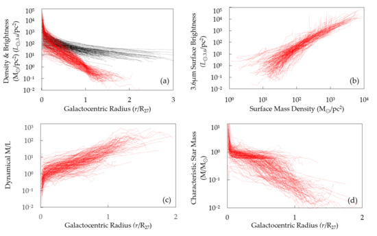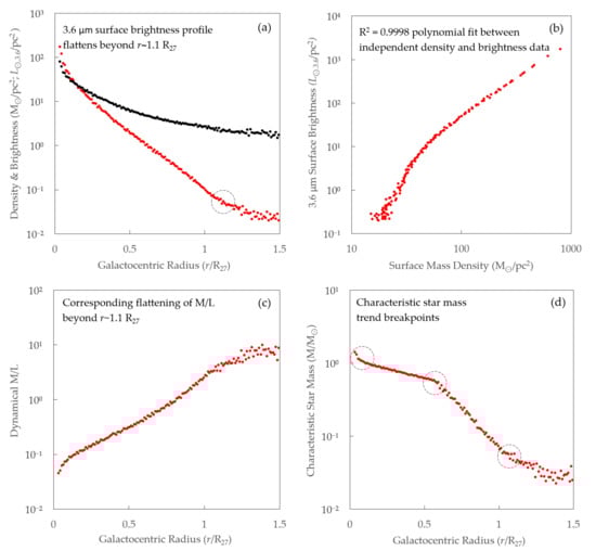 Illustration of mass–luminosity analytics for 214 galaxies. (a) Surface mass density profiles computed from individual galaxy rotation curves using DM2 model (black curves) superimposed with Spitzer 3.6 μm inclination-corrected surface brightness profiles (red curves); (b) correlation between density and brightness datapoints; (c) rolling M/L profiles; (d) radial profiles of characteristic star mass.