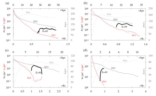 Representative cases for a subsample of 82 galaxies showing some excess density: (a) NGC5907; (b) NGC4157; (c) NGC0300; (d) NGC2915. Red and black thin curves represent surface brightness S(r) in L⊙,3.6/pc2 and surface mass density ∑(r) in M⊙/pc2, respectively (left side Y-axis). The Black thick curve is density excess above light-constrained stellar density ∑ex(r) in M⊙/pc2 (left side Y-axis). The dashed grey curve is rotation curve V(r) in km/s (right side Y-axis). Lower X-axis is a galactocentric radius in units of r/R27. Upper X-axis is a galactocentric radius in units of r/kpc.
