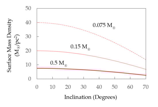 The average S4G surface brightness profile is stated to trace isophotes at μ3.6(AB)(1σ) ∼27 mag/arcsec2, which is stated to be equivalent to a stellar mass surface density of ∼1 M⊙/pc2 []. Such a low surface density threshold is misleading. The 1 M⊙/pc2 interpretation is correct only for the stellar population including Sun-like or heavier stars. If one assumes a population of red dwarfs of masses approaching 0.075 M⊙ (minimal star mass corresponding to the hydrogen-burning threshold), then Spitzer IRAC channel 1 sensitivity drops to ≈C × 40 M⊙/pc2, where C is inclination correction (Figure 12). Such a red dwarf population with a density below C × 40 M⊙/pc2 will likely appear noisy or indistinguishable from the background in Spitzer 3.6 μm filter. Forty percent of 82 galaxies have excess density datapoints below the visibility threshold for 0.075 M⊙ stars.
