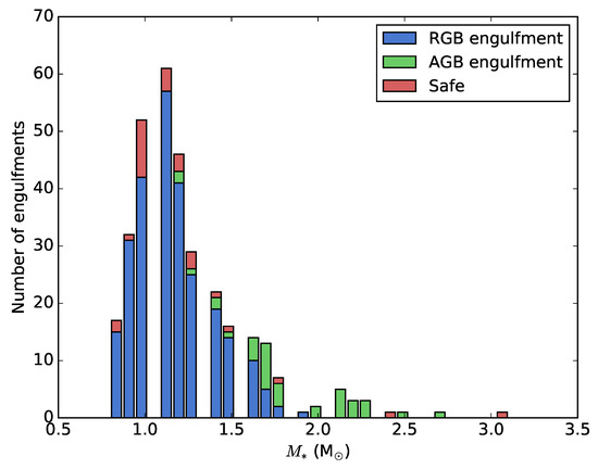 Histogram displaying the resulting number of planet engulfment of the known exoplanets as a function of stellar mass. In this model, each star–planet system is evolved using stellar models with the measured metallicity of the host star.