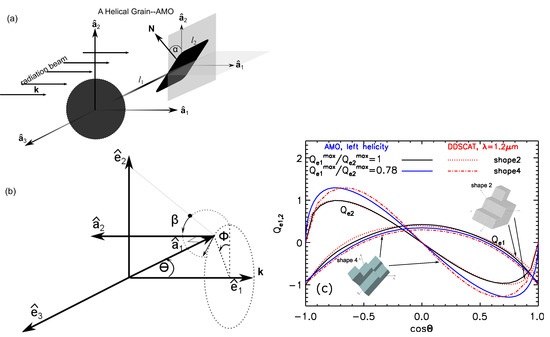 Figure 1. Panel (a): A helical grain model described by three principal axes, a ^ 1 a ^ 3 a ^ 3 , proposed by Lazarian and Hoang [29] to calculate analytically Radiative Torques (RATs), comprising an oblate spheroid and a massless mirror attached to the spheroid. The normal vector of the mirror is titled by an angle α with respect to the principal axis a ^ 2 . Panel (b): Scattering coordinate frame of reference used for calculations of RATs, described by three axes, e ^ 1 e ^ 2 e ^ 3 where e ^ 1 is defined along k , and e ^ 2 e ^ 3 form a plane perpendicular to e ^ 1 . Θ is the angle between the axis of maximum moment of inertia, a ^ 1 , with the radiation direction k , Φ is the precession angle of a ^ 1 around k , and β is the angle that describes the rotation of the grain around a ^ 1 . Panel (c): comparison of the functional form of RATs from AMO and numerical computation using DDSCAT. From Lazarian and Hoang [29].