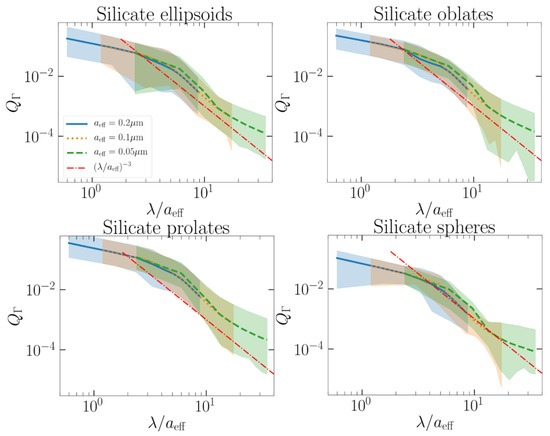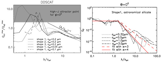 Figure 2. Radiative torques computed for the different grain sizes and shapes using DDSCAT from Lazarian and Hoang [29]. Left and right panels show the ratio of maximum torque components and RAT magnitude as function of λ / a eff . Astronomical silicate is considered. Power-law fits to the computed results are shown in red lines.