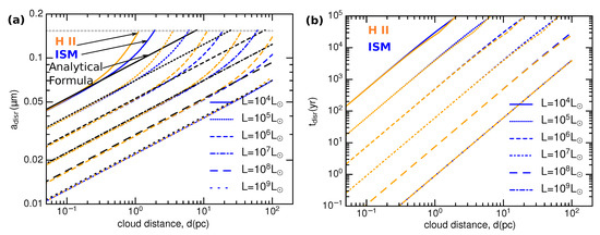 where L UV is the luminosity in the optical and UV, which is roughly one half of the bolometric luminosity, and T sub is the dust sublimation temperature between 1500–1800 K for silicate and graphite material (Guhathakurta and Draine [46], Scoville and Norman [48]). This relation is obtained using U 2.5 × 10 6 ( L U V / 10 9 L ) ( R / 1 p c ) 2 , which corresponds to T d 22.3 U 1 / 5.6 K for graphite grains and L b o l = 2 L U V . By setting T d = 1800 K , one obtains