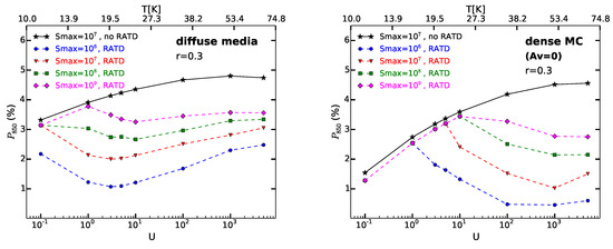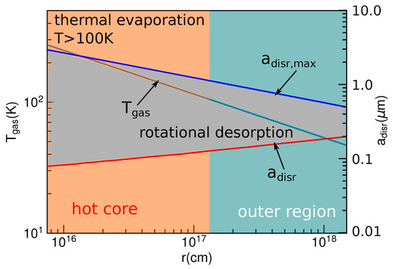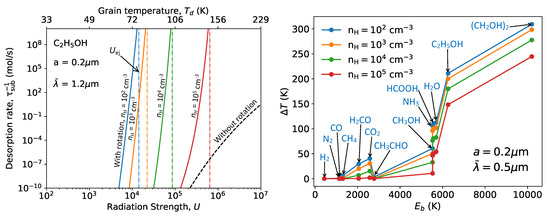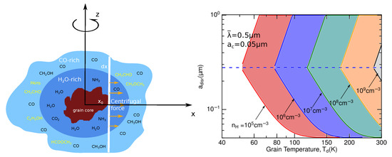 In particular, centrifugal forces on rapidly spinning grains have inevitable effects on the formation and desorption of molecules on/in the ice mantles of dust grains. The reason is that water and complex molecules in the ice mantles sublimate at temperatures of T d > 100 K (Herbst and van Dishoeck [2]), which corresponds to U > 10 5 , that is, much stronger radiation fields than the ISRF for which RATD is important. As shown in Hoang and Tram [44] and Hoang and Tung [45], the grain suprathermal rotation also affects the chemical composition and metallicity of the gas because ice mantles on the grain surface are easily disrupted by centrifugal stress.