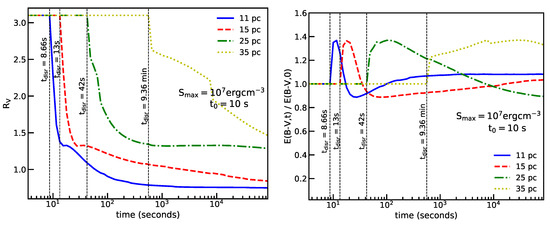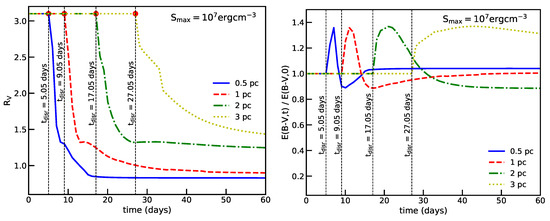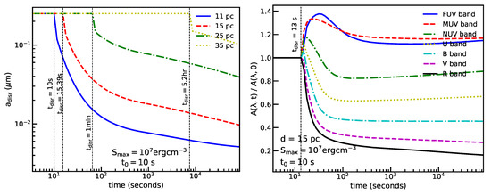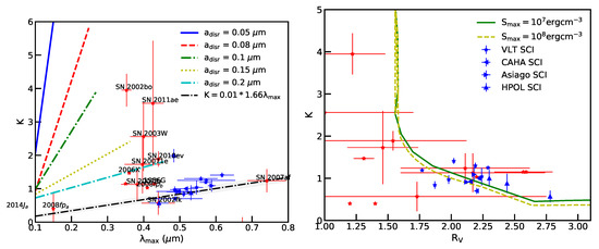 The above paradigm of dust evolution is challenged by the early-time observations (within weeks since the first light) toward type Ia supernovae (SNe Ia). Indeed, numerous observations reveal anomalous properties of dust, namely the predominance of small grains in the local interstellar medium of SNe Ia (Phillips et al. [18]), which is characterized by the unusually low value of total-to-selective extinction ratio, R V = A V / E B V < 2 (Burns et al. [19], Amanullah et al. [20], Cikota et al. [21]). This is inconsistent with the standard model of interstellar dust with the standard value of R V = 3.1 (Phillips et al. [18]) and requires enhanced abundance of small grains Nozawa [22]. A similar problem is demonstrated through mid-infrared emission excess (1–5 μ m) in the spectrum of massive young stellar clusters, which requires an enhanced abundance of small grains relative to large ones. Extinction curves with a steep far-ultraviolet (UV) toward Gamma-ray bursts (GRBs) or quasars also reveal anomalous dust properties with the predominance of small grains. These puzzles cannot be explained with previously known mechanisms of dust destruction (Hoang [23]).
