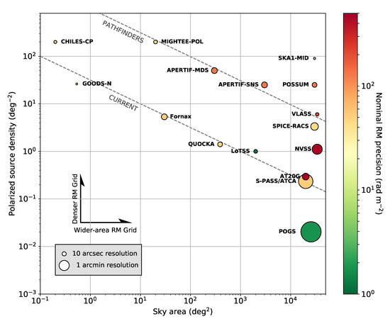 Illustration of the Rotation Measure (RM) grid survey strengths of various existing and future radio surveys. The size of each marker reflects the angular resolution of the survey, and the colour indicates the nominal RM precision that can be reached, where green indicates the capacity for measurements with lower RM uncertainties. Diagonal dashed lines are intended to highlight the locus of “current” (lower) and “pathfinder” (upper) survey capability.