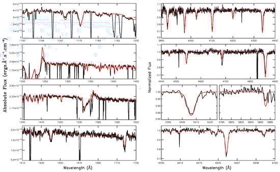 An illustration of a cmfgen spectral fit to the SMC star AzV177 [O4V((ff))] []. The model has K, , , , km s, and . Credit: Bouret et al., A&A, 2013, 555, A1 [], reproduced with permission © ESO.
