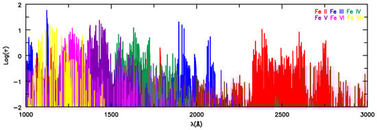 Illustration of the location of the strongest Fe lines in the UV spectral window. Different ionisation stages tend to dominate different spectral regions.