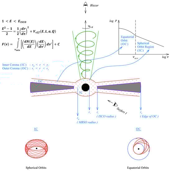 - We associate the temporal frequency, , in the observed power spectral density with the fundamental azimuthal frequency of the particles orbiting in the circular orbits in the accretion disk outside ISCO, , and both circular and spherical trajectories between and marginally bound spherical orbit (MBSO) radius, . These frequencies are functions of the orbital radius, r or , (Equations (7a) and (8a)), and hence they are also fundamentally related to the mechanical energy of the orbit through Equations (14) and (15).