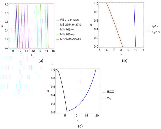 - We have computed the contours of , using Equation (7a), for the QPO frequencies (given in Table 2) of RE J1034+396 (blue), MS 2254.9-3712 (red), and MCG-06-30-15 (magenta), shown in the plane in Figure 3a. The masses of these black holes were assumed from the previous estimations (see Table 2). We see that the QPO emission originates from a very narrow region of the accretion disk, where (9.4–9.9) for RE J1034+396, r∼(10.4–11.4) for MS 2254.9-3712, and for MCG-06-30-15 even though a ranges from 0 to 1. This implies that the QPO emission region is very close to the black hole, and this emission region remains very narrow and nearly independent of the spin of the black hole.