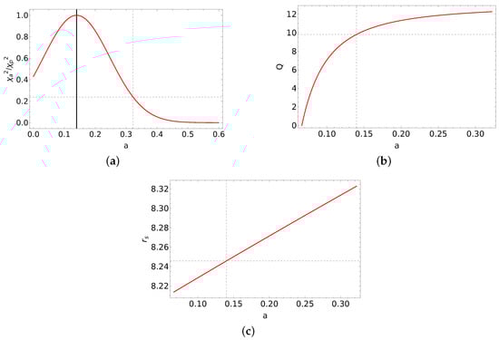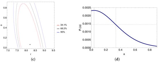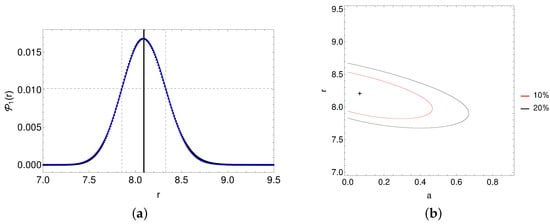 - Next, we obtain the distribution function of a given byA plot of is shown in Figure 6a, where . We obtain the errors with respect to by normalizing the function and obtain , where the region of 95% probability is indicated by the vertical dashed line in Figure 6a. We also show the range of and Q in Figure 6b,c within the region of a, as seen in Figure 6a, where the parameter ranges are (8.214–8.323) and (0.0001–12.264).
