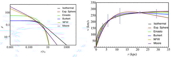 - Einasto profile [19]:where is the Einasto free parameter. This extra parameter determines the degree of curvature (shape) of the profile. If are identified with cuspy halos, while for presents a cored-like behavior. The Einasto profile is quite different from the other models, whose slope is a power-law function. The larger , the more rapidly the slope varies with radius [20].