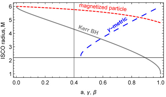 - The external magnetic field can mimic the rotation parameter of the Kerr BH through astronomical observations of the motion of magnetized particles around Schwarzschild BH immersed in an external asymptotically-uniform magnetic field providing exactly the same values of the ISCO radius. One can see from Figure 8 (blue large dashed line) that the values of the magnetic coupling parameter can mimic the spin of rotating Kerr BH up to .