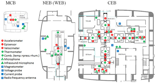 The auxiliary monitors of the Virgo environment are essential for tracking sources and studying their influences. A distributed network of environmental probes was initially setup for Virgo [23] and, subsequently, expanded and enhanced for Advanced Virgo. In Figure 2, we show the current layout of sensors deployed in the central building, the input mode cleaner building, and the two buildings at the end of the North and West arms [24]. Other monitored locations are: the laser clean room hosting the in-air (i.e., at ordinary atmospheric pressure) benches carrying the laser source and input optics; the detection clean room hosting the in-vacuum suspended bench with the readout photodiode and the in-air bench for squeezed light injection; and a few electronic rooms. There are two categories of sensors: fast sensors, sampled at 1 kHz to 20 kHz according to the probe operating bandwidth, and slow sensors, which were sampled at 1 Hz. Table 1 provides a list of the sensors in use.