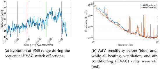 One sequential switch off of all Virgo HVAC units was performed on 19 April 2019, and it lasted about 40 min. before restoring the initial condition. The effect was in real time visible in the BNS range online monitor (Figure 3a). Hrec noise reduced significantly below 30 Hz (Figure 3b). The time of the noise reduction could be correlated with the turning off of the HVAC unit serving the detection clean room. On 27 October 2019, a similar sequential switch off highlighted a new issue. The noise bumps at 20 Hz and 40 Hz in the strain ASD turned out to be correlated with the acoustic noise inside the laser clean room. Of course, air conditioners could not be kept off, but the tests provided useful hints. Subsequently, the investigation proceeded with techniques that permitted a more precise localization of the scatterer.