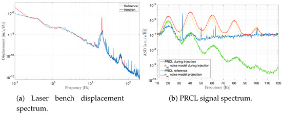 These bumps can be reproduced by a simplified version of the scattered light model of Equation (1), as demonstrated in Figure 4b. In this case, the model is used to estimate not the strain noise but the PRCL noise due to scattered light. We used for the horizontal bench displacement measured by the seismic sensor. The scale factor C is determined by best matching the model (yellow curve in Figure 4b) and the data measured during injection (red curve in Figure 4b). The obtained value is . The simplified model consisted in assuming unitary phase and amplitude noise transfer functions. For a thorough understanding of the noise path, the and functions should be estimated and applied. Despite this simplification, the reasonable match between the data and model was sufficient to localize the source in the laser bench. In Figure 4b, the green curve also shows that the same model applied to the quiet data (i.e., in the absence of external stimuli) roughly explains the residual PRCL bumps noise.