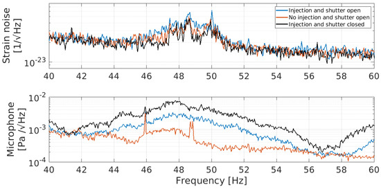 The amplitude spectral density of Hrec (top) and microphone (bottom) on the external squeezer bench, in reference condition (red) and when generating sound inside the room (blue), and then repeated after having blocked the beam onto the bench (black).