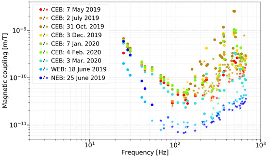 Magnetic coupling functions for CEB, WEB, and NEB. For CEB multiple injections over the time of O3 are shown to illustrate the time variations. Dots are measured values of the magnetic coupling, while stars are upper-limits, calculated using Equation (2).