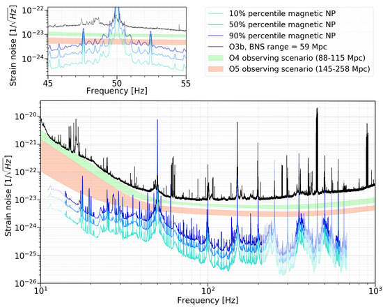 Figure 8 reports the noise budget of ambient magnetic noise in the Virgo central area. In order to visualize the variability of the ambient fields, projections are computed while using percentile ASD of the ambient fields.