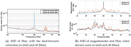 However, one residual noise was present in the interferometer strain signal as reported in the bottom panel of Figure 9b. The noise was shaped as symmetric peaks around 50 Hz, namely sidebands. The most pronounced being a pair of peaks that could be grouped in two families: Hz with its double at Hz, and Hz with its double at Hz and triple at Hz.