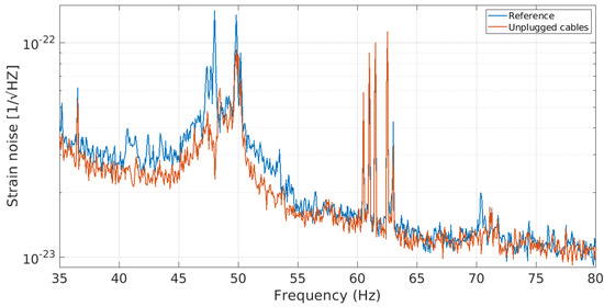 - Paoletti, F.; Fiori, I.; Soldani, D.; D’Andrea, M. TEST: Separating CEB and MCB Mains Lines, and Reducing the Unwanted Coupling between Them (50 Hz HVAC Sidebands in Hrec). November 2019. Available online: https://logbook.virgo-gw.eu/virgo/?r=49102 (accessed on 4 December 2020).