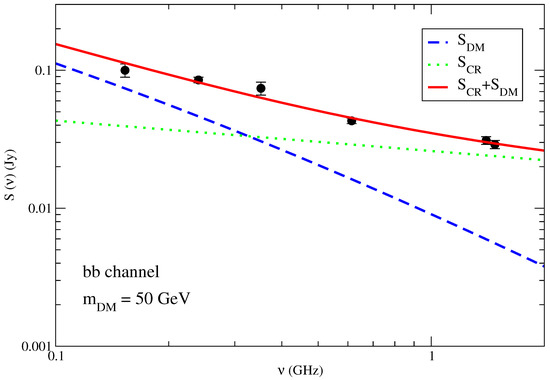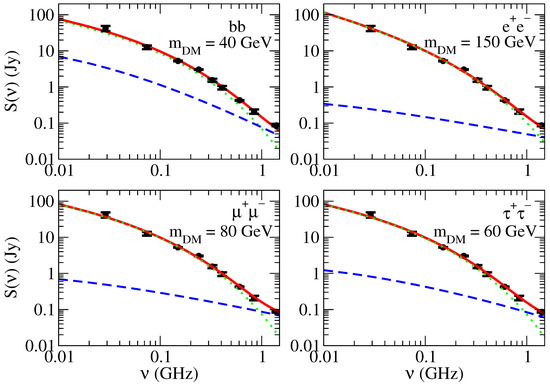 This method can give more stringent constraints for dark matter mass and annihilation cross-section. More importantly, it can reveal some possible signals of dark matter annihilation if there exists a “radio excess” in the frequency spectrum. It can provide an indirect way to search for the signal of dark matter annihilation. Recent studies using the total radio flux density spectra of the Ophiuchus cluster (the central region only) [95], the Abell 697 cluster [96], and the Abell 4038 cluster [97] revealed some possible signals of dark matter annihilation (see Figure 2, Figure 3 and Figure 4) [37,38,39]. Assuming the thermal annihilation cross-section, the best-fit dark matter mass is 30–150 GeV for four representative annihilation channels (, , , and ). This range is consistent with the results in many recent gamma-ray studies (e.g., 30–35 GeV via [98]; 30–40 GeV via [4]; 80 GeV via [2]) and anti-proton studies ( = 48–67 GeV via ) [99]. Note that for the Abell 4038 cluster, the cosmic-ray model can give a good fit for the radio relic (the major cosmic-ray source) only, while the two-component model (dark matter plus cosmic-ray contribution) can give a better fit for the total radio flux density spectrum (see the discussion in [39]).