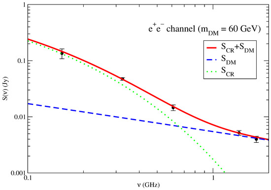 where is the critical synchrotron frequency and is the synchrotron kernel function. Since the radio emissivity is mainly determined by the peak radio frequency (monochromatic approximation), the kernel function can be approximated by , and the total radio flux density contributed by dark matter annihilation at frequency is given by [48,49]: