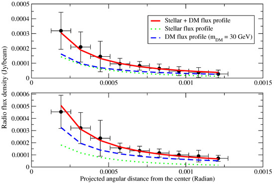 The best-fit thermal dark matter scenario for the radio emission profile of the M31 galaxy (assumed GeV) [102]. The red solid line, green dotted line, and blue dashed line represent the total predicted radio flux profile , the stellar flux contribution, and the dark matter contribution, respectively (upper: 8.35 GHz; lower: 4.85 GHz). The radio data were extracted from [62].