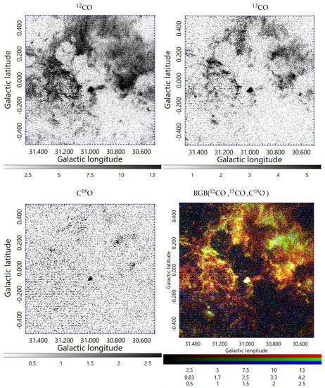 Brightness-temperature () maps of the G31+00 region at 81.675 km sin the CO, CO, and CO lines, and a color-coded (RGB) map of CO (red, 0– 15 K), CO (green, 0–5 K), and CO (blue, 0–3 K).