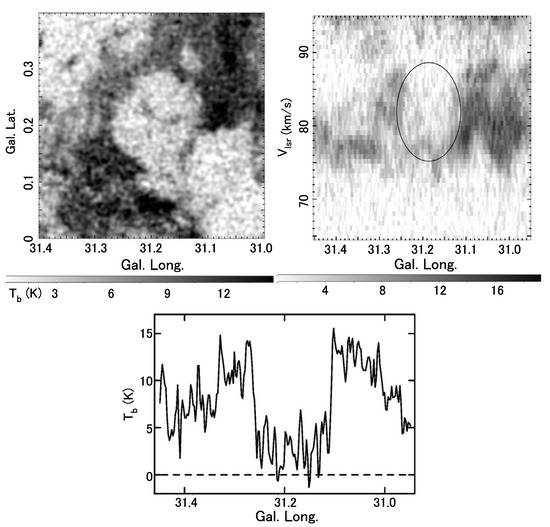 Figure 1 shows typical cases from a channel map, where CO bubbles at G31.2+0.2+81 at km sare shown by a composite color-coded map of CO brightness in red ( from 0 to 15 K), CO in green (0 to 4 K), and CO in blue (0 to 2 K). Several almost empty cavities, each about in diameter, are aligned from G30.8-0.2 to G31.2+0.2, apparently in touch with each other. The surrounding molecular gas makes shell structures with enhanced density. Since there is no signature of excess in green intensity (CO line), the molecular gas is mildly compressed at the bubble edges.