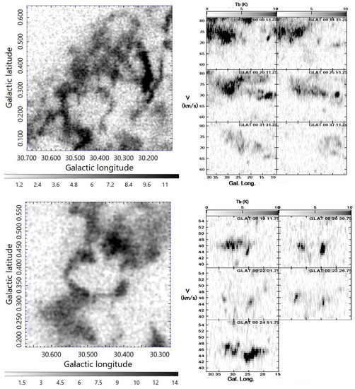 - Stil, J.M.; Taylor, A.R.; Dickey, J.M.; Kavars, D.W.; Martin, P.G.; Rothwell, T.A.; Boothroyd, A.I.; Lockman, F.J.; McClure-Griffiths, N.M. The VLA Galactic Plane Survey. Astron. J. 2006, 132, 1158–1176. [Google Scholar] [CrossRef]