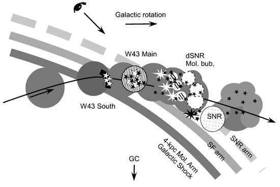 Figure 5 illustrates the evolutionary scenario along a flow line of the Galactic rotation. It schematically explains the spiral arm structures of molecular clouds, HII regions and of SNRs, according to the evolutionary scenario under the galactic shock wave theory, as summarized in the following subsections.