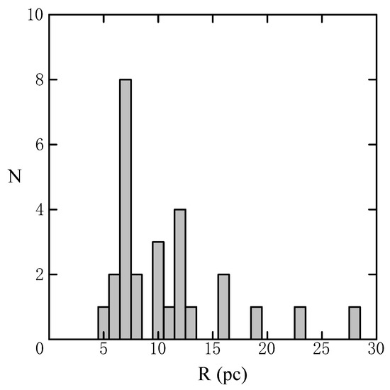 As readily shown in Figure 1 and Figure A1 and Figure A2 in Appendix A, the analyzed region is full of molecular bubbles. Identified bubbles in the region are listed in Table A1 with their positions, radii, radial velocities, and velocity widths, and are plotted in Figure A3. In Figure 6 we show the frequency distribution of the radii of the listed bubbles. The bubbles have a typical radius of pc, spreading from 5 to 15 pc. Some arc shaped filaments with larger radii or length of 15 pc are also found in the maps, which are supposed to be segments and/or remnants of CO bubbles. Besides those counted here, there appear a larger number of fainter shells and arcs that cannot be measured on the maps. So, the here listed bubbles may be a minimal set of dark SNRs in the analyzed region.