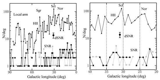 If the bubbles are relic of buried SNRs, the radii and expanding velocities suggest that their ages are on the order of ∼ My. This is an upper limit to the age, and the real dSNRs would have evolved a bit rapider due to cooling effects. So, we here assume that their ages are on the order of y. As counted in the Appendix A, the number of CO bubbles in the longitude range from to is per 2 degrees in longitude, or per degree. On the other hand, the catalogued SNRs yields N∼3 per degree in the same direction. In Figure 7 we plot the thus estimated counts in comparison with those of the catalogued SNRs [4,5] as well as with the number of HII regions per degree [41].