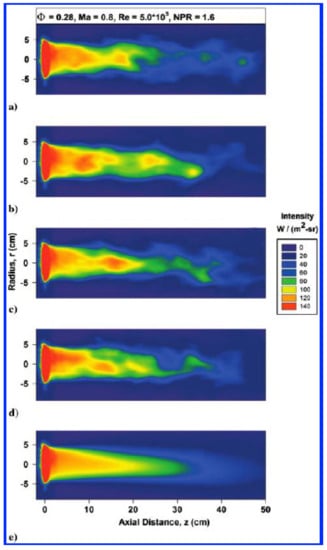 Infrared radiation intensity measurements in a plume (Mach 0.28, exit temperature 800 K): (a–d) instantaneous (elapsed time of 12 ms); (e) averaged. (from [14]).