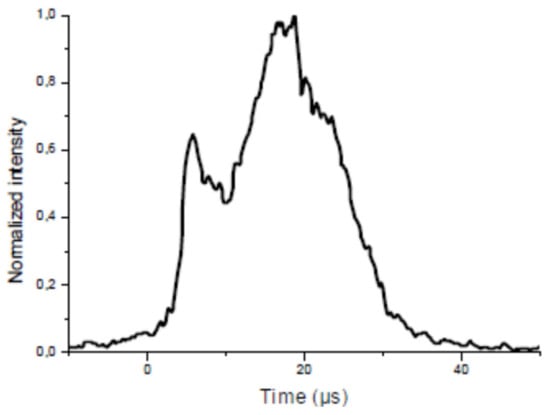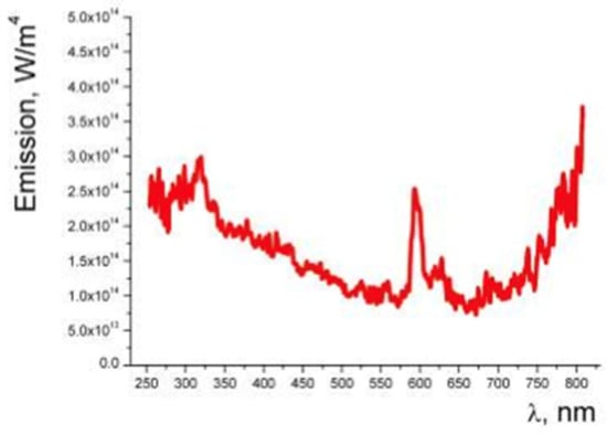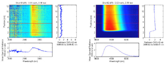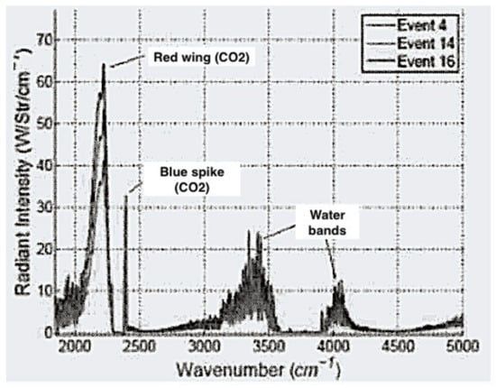 A similar experimental study on plume infrared signature was recently conducted by Higgins et al. [15], but for at higher temperatures, above 2000 K. These authors performed infrared radiation emission measurements of a liquid engine plume, measuring plume radiant intensity profiles, plume IR image, and plume spectral emission distribution. An example of the results obtained, with water and CO2 measured bands is shown in Figure 4.