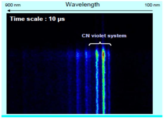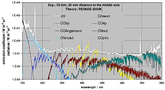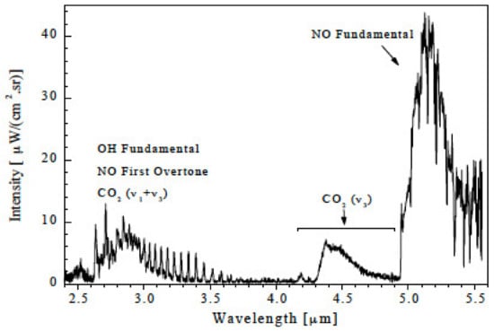 In the same context of infrared signature measurements, Packan et al. [16] have carried out an extensive experimental campaign on radiation in low temperature air plasma. For the tests, air was containing small quantities of CO2 and H2O, measurements were performed in a 50 kW inductive plasma torch at 3400 K. Measured emitted spectrum is shown in Figure 5, highlighting the contributions of NO, OH, CO, and CO2 bands.