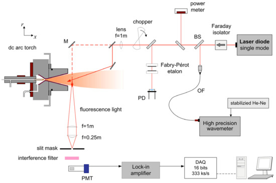 - Löhle, S.; Vacher, D.; Menecier, S.; Dudeck, M.; Liebhart, H.; Marynowski, T.; Herdrich, G.; Fasoulas, S.; André, P. Measurement campaigns on Mars entry plasmas using ICP torches. Characterization by emission spectroscopy and probe techniques, ESA SP-689. In Proceedings of the 4th International Workshop on Radiation of High Temperature Gases in Atmospheric Entry, Lausanne, Switzerland, 12–15 October 2010. [Google Scholar]