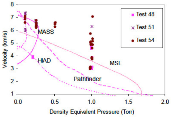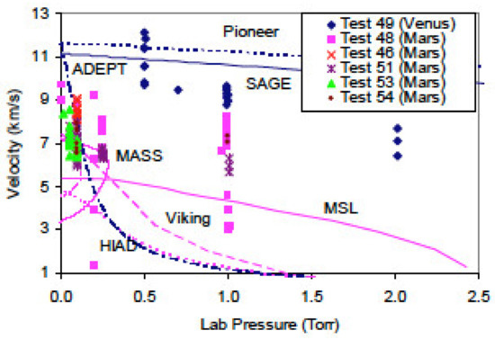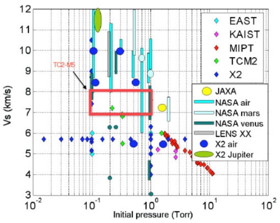 Among the available facilities such as shock and expansion tubes, for investigating radiation and chemical kinetics for Mars entry, EAST has been the most used and extensive test campaigns carried out for a wide range Mars entry conditions. Some of these test conditions have been summarized by Cruden [17] in Figure 7.