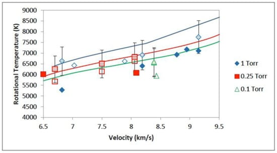 The study carried out by Martinez [1] focuses more particularly on CN, and C2 and their related rotational temperatures. The results obtained for the rotational temperature as function of the shock velocity are displayed in Figure 8. They highlight the increase of the rotational temperature with the shock velocity. The spectra from 120 to 1520 nm, obtained by Martinez [1] for both Mars aerocapture, at 6.5, 7, and 8.5 km/s, and Venus entry conditions, at 9.5, 10.6, and 11.4 km/s, are shown in Figure 9. Datasets cover VUV up to NIR radiation, with the major contribution in the VUV. The VUV range is dominated by the CO(4+) system, two carbon atomic lines are also present at 193 and 248 nm.