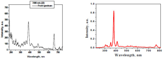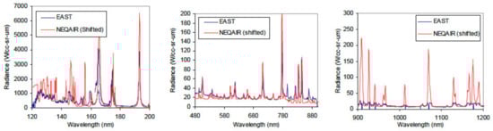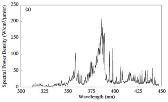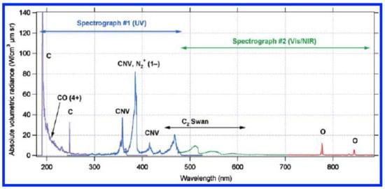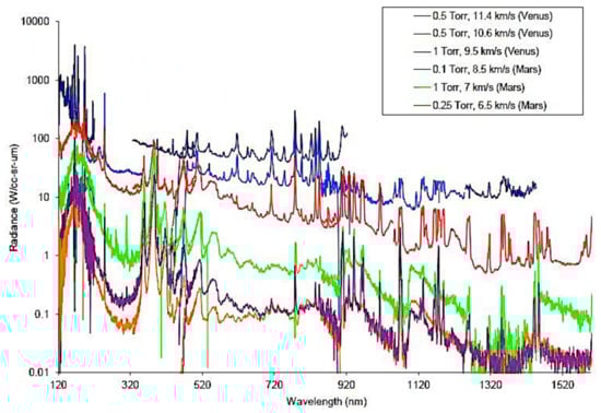 Radiation emission spectra from VUV to mid-IR for Earth, Venus, and Mars entry conditions have been compared in [20] they are plotted in Figure 15. In the same contribution, Cruden [20] has provided extensive details on the calibration of the different measurement techniques used for the test campaigns including the deuterium and mercury lamps for VUV and UV-VIS measurements respectively. Mercury lamp is used for spectral calibration using atomic line sources in UV-VIS, in the infrared, typically, Hg lamps are used for the same finality. For calibration below 300 nm, a deuterium source is frequently used; other options are possible (H2 or Ar arc lamps, Xe lamps, or hollow cathode discharges). Lamps are thermally driven, and as they are limited by the Planck curve they generally do not get hot enough for short wavelength ranges characteristic of V, and VUV radiation.