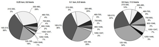 The contributions to the total radiance for different wavelength bands have been computed by Cruden et al. [17] and are shown in Figure 10. The first contribution for all pressures and velocities is from VUV to far UV wavelengths, in between 125–215 nm, with 45 to 58% of the total radiation. At these wavelengths the radiation is mostly produced by the CO 4th positive system and from NO. The IR radiation above 900 nm is small with around 10 % of the total radiation. The radiation in the visible domain can be mainly attributed to the CN red system. The region in between 330 and 480 nm, contributes to 35% of the total radiation at 6.5 km/s. This strong contribution decreases at higher velocities, with 12% at 11.5 km/s due to the dissociation effects that are strong. Radiation from C2 Swan, 480–700 nm is for the different cases lower than 10% of the total radiation.