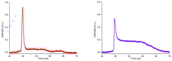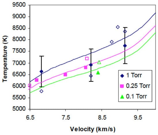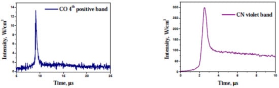 - Kozlov, P.V.; Romanenko, Y.V.; Shatalov, O.P. Radiation intensity measurement in simulated Martian atmospheres on the double diaphragm shock tube, ESA SP-689. In Proceedings of the 4th International Workshop on Radiation of High Temperature Gases in Atmospheric Entry, Lausanne, Switzerland, 12–15 October 2010. [Google Scholar]