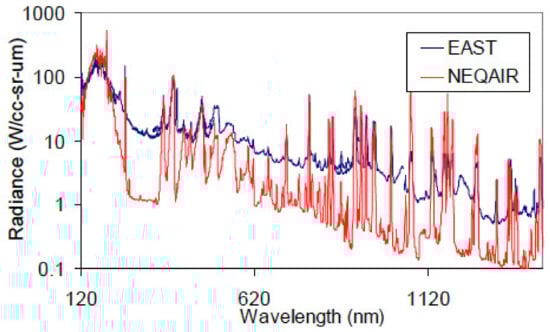 Comparison between EAST data and NEQAIR for Venus entry at 1 Torr and 9.5 km/s [17].