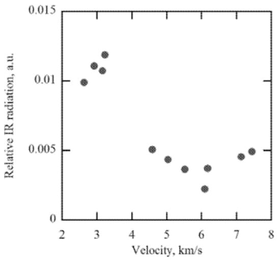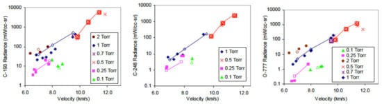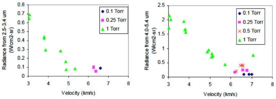 Other test campaigns for Venus entry conditions (3–12 km/s 0.1–2 Torr) were conducted in EAST [17,18] spectral radiance was investigated from VUV through mid-IR (120–1650 nm, and 3000–5000 nm). Tests conditions are plotted in Figure 7. Resolved spectra of the CO 4th positive band in the VUV was also reported for the first time. Measurement of CO2 molecular vibrational radiation was also attempted for low velocities. The contributions of the different spectral regions from VUV to IR, to the total radiance for Venus and Mars entry conditions are resumed in Figure 10. Mid IR was only investigated at low velocities (3–4 km/s). For the other measurements medium resolution imaging was performed for C2 Swan, CN Violet, O 777 nm triplet and C 193 and 248 nm lines.