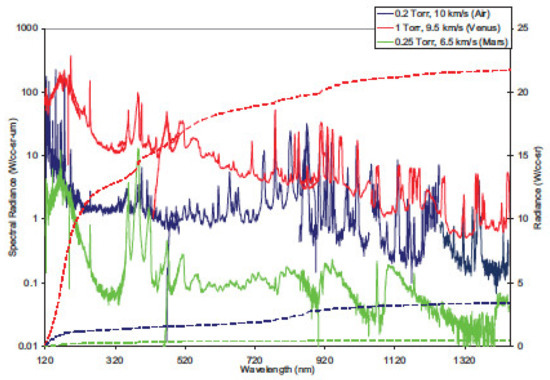Equilibrium radiation spectra and total radiative flux (dashed lines) for Earth, Venus and Mars entry conditions [20].