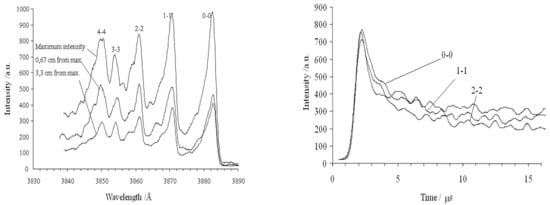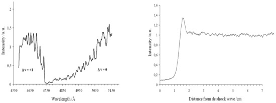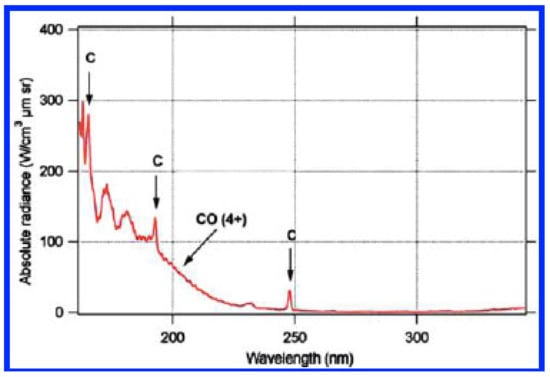 The high velocity range, corresponding to Mars aerocapture conditions, has been studied by Grinstead et al. [23] who have investigated the radiation and species kinetic relaxation for a Mars atmosphere at 0.1 Torr and a shock velocity of 8.6 km/s. Emission spectrum from VUV up to NIR has been measured and is displayed in Figure 17. The major source of radiance is from CO(4+) system even if CN violet, N2+ (1-) and C2 Swan systems as well as several atomic lines for carbon and oxygen are present. High-resolution spectra with corresponding spatial variation of radiance for CN violet and C2 Swan bands have been also published. Detailed VUV part of the spectrum is shown in Figure 18.