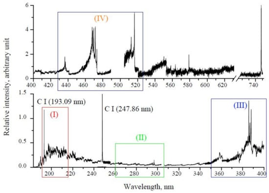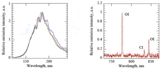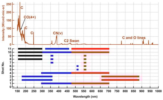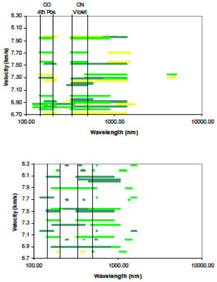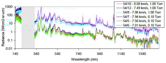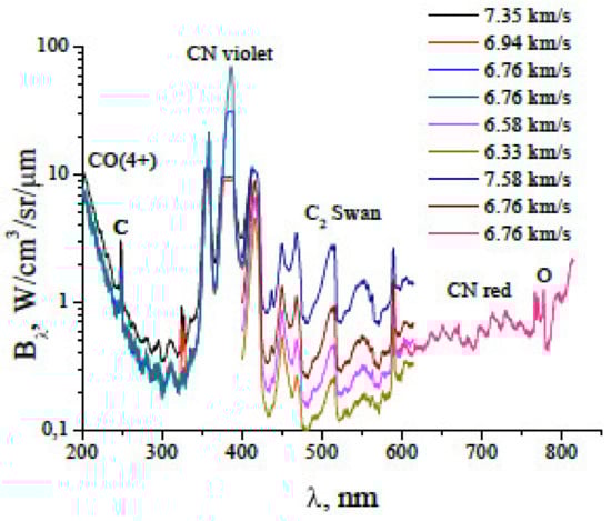 The analysis of the different tests shows that below 10 km/s, there is a strong emission from 120–300 nm, due to the CO 4th positive system reaching a maximum at 160 nm, this is the dominant feature in the spectrum. Other major contributors to radiation emission are, NO, strong atomic lines of C, O, and N, and CN Violet, with the four bands at 359, 388, 422, and 461 nm, corresponding to CN Violet system. The radiation intensity emitted by the CN Violet system, increases with the velocity up to 10 km/s, then decreases and vanishes, since the energy present in the flow is sufficient to dissociate the molecule. Swan band for C2, in between 500 and 700 nm, is also present in Figure 9, but at a much weaker level than CN. Like for CN, C2 contribution disappears above 10 km/s due to dissociation effects. The same phenomenon applies to the CN red system, which is strong in the NIR above 700 nm below 9 km/s and vanishes when the shock velocity increases. With the increase in velocity, the atomic lines become visible, as highlighted in Figure 9, with the oxygen atomic triplets at 777 and 1130 nm, and the C atomic lines and 193, 248, and 1069 nm. However, the main features when increasing the velocity is the growth of the background continuum radiation certainly due to interactions between the electrons and atomic and molecular species that include free-bound and bremsstrahlung processes.