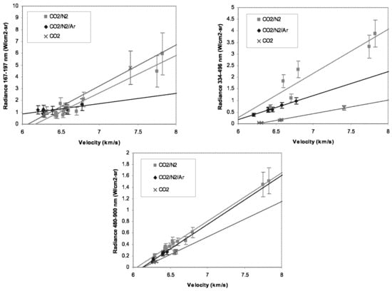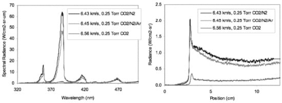 - Cruden, A.B.; Brandis, A.M.; Prabhu, D.K. Compositional dependence of radiance in CO2/N2/Ar systems, AIAA Paper 2013-2502. In Proceedings of the 44th AIAA Thermophysics Conference, San Diego, CA, USA, 24–27 June 2013. [Google Scholar]