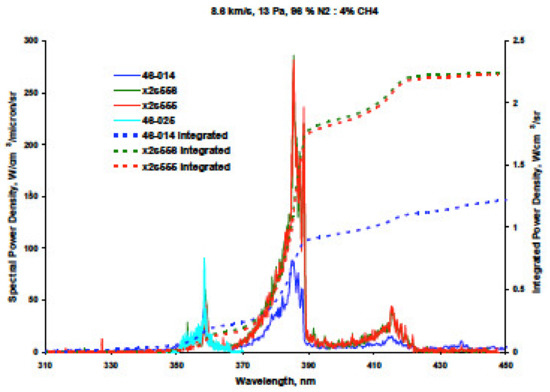 - Cruden, B.A.; Prabhu, D.; Martinez, R.; Le, H.; Bose, D.; Grinstead, J.H. Absolute radiation measurement in Venus and Mars entry conditions, AIAA Paper 2010-4508. In Proceedings of the 10th AIAA Joint Thermophysics and Heat Transfer Conference, Chicago, IL, USA, 28 June–1 July 2010. [Google Scholar]